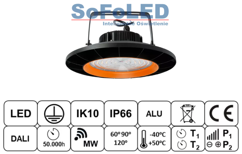 Oprawy typu High Bay „UFO”. Doskonale sprawdzająca się do oświetlania magazynów, wiat, obszarów produkcji, sal gimnastycznych. Występuje w 3 rodzajach układów optycznych o kącie świecenia 60º, 90º, 120º. Montaż opraw na wysokości od 4m do 15m. Oprawy doskonale współpracują z czujnikami ruchu model MC054VD RC