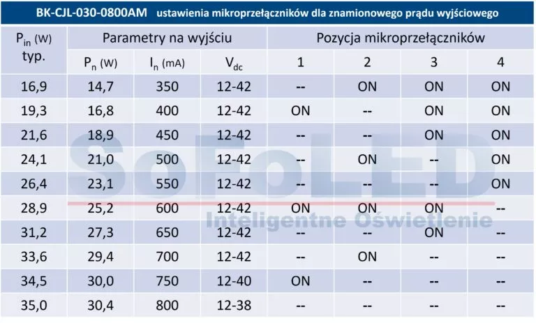 Poniżej tabele możliwych ustawień prądów znamionowych na przykładzie zasilacza o mocy 30W i 40W