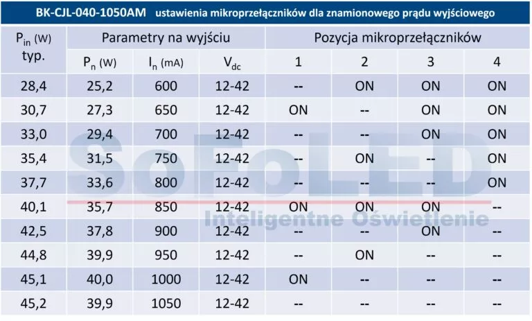 Znamionowy prąd wyjściowy ustawiany za pomocą mikroprzełączników („DIPSWITCH”) – 10 ustalonych wartości dla każdego modelu.