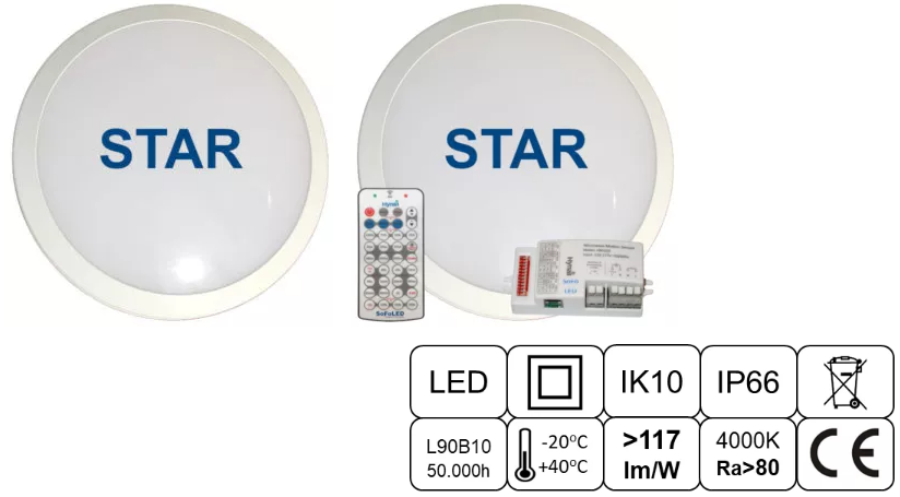 Plafony mogą występować w wersji włącz/wyłącz lub inteligentnym czujnikiem ruchu ON/OFF. W przypadku zastosowania inteligentnego czujnika ruchu istnieje możliwość zdalnej regulacji, za pomocą pilota IR, wszystkich nastaw.