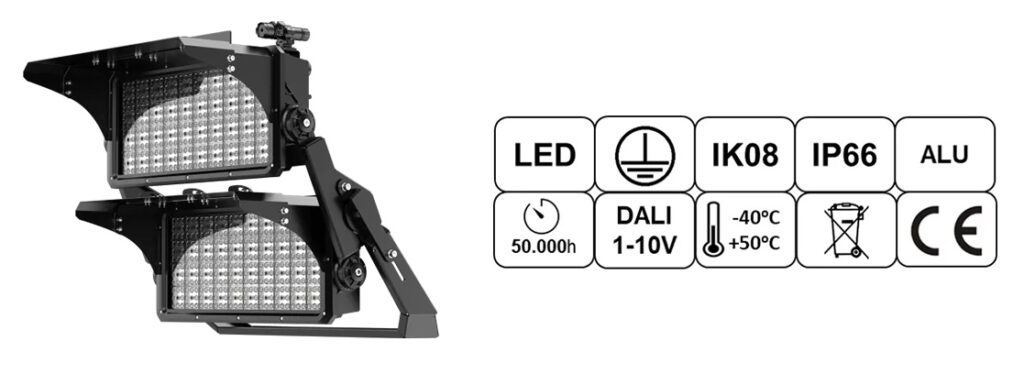 Przeznaczone między innymi do oświetlania wnętrz i obszarów zewnętrznych o dużej wilgotności i zapyleniu np. stadionów sportowych hal magazynowych, przemysłowych, hal produkcyjnych, wiat składowych, zadaszeń, kortów tenisowych i sal gimnastycznych, tuneli, bocznic kolejowych itp. Dzięki dedykowanym soczewkom można uzyskać optymalny stosunek mocy oprawy do natężenia oświetlenia w polu zadanym. IP66 – rzeczywista wodoodporność.